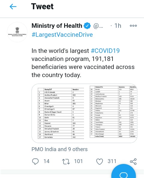 প্রদ্যুত দাস : করোনা মোকাবিলায় দেশ জুড়ে টিকাকরণের বিশাল অভিযান শুরু হয়ে গেল শনিবার থেকে । এদিন সারা দেশে ১ লক্ষ ৯১ হাজার ১৮১ জনকে টিকার প্রথম ডোজটি দেওয়া হয়েছে বলে কেন্দ্রীয় স্বাস্থ্য মন্ত্রণালয় সূত্রে জানানো হয়েছে। এরা প্রত্যেকেই করোনার বিরুদ্ধে যুদ্ধে প্রথম সারির সৈনিক । শনিবার সকালে দেশ ব্যাপী টিকাকরণের সূচনা করেন প্রধানমন্ত্রী নরেন্দ্র মোদী। প্রধানমন্ত্রীর ভাষণ শেষ হওয়ার পরেই দেশের তিন হাজার ছয়টি কেন্দ্রে টিকা দেওয়ার কাজ শুরু হয়ে যায় । প্রত্যেকটি কেন্দ্রে রোজ ১০০ জনের শরীরে টিকা দেওয়া হচ্ছে । ভ্যাকসিন দেওয়ার এই বিশাল কর্মযজ্ঞে ১৬ হাজার ৭৫৫জন স্বাস্থ্যকর্মী নিয়োজিত আছেন।