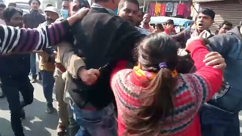 | উত্তেজিত জনতার হাত থেকে অভিযু্ক্তকে রক্ষা করছে পুলিশ |