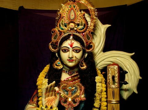 | বীণা বাদনরতা দেবীর এক হাতে অক্ষমালা আরেক হাতে বেদপুস্তক |