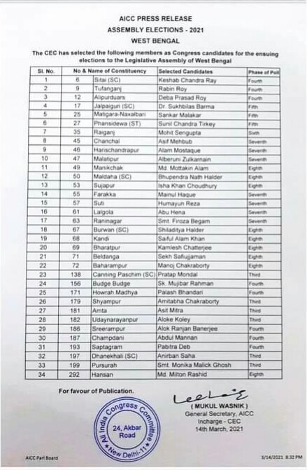 | কংগ্রেসের ৩৪ প্রার্থীর তালিকা । |
