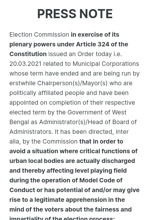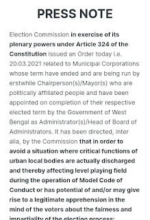 শিলিগুড়ি সহ গুটিকয়েক পুরসভা ব্যতীত অধিকাংশ পুরসভা তৃণমূলের নিয়ন্ত্রণে থাকায় তৃণমূলের লোকেরাই একের পর এক পুরসভার প্রশাসক পদে আসীন হন । নির্বাচনের দিন ঘোষণার পরেই এ নিয়ে কমিশনের কাছে অভিযোগ জানিয়েছিল বিরোধীরা । বিরোধীদের অভিযোগকে মান্যতা দিয়ে শনিবার সন্ধ্যায় সবকটি পুরসভার প্রশাসক পদ থেকে রাজনৈতিক ব্যক্তিত্বদের অপসারণের নির্দেশ দিল নির্বাচন কমিশন ।