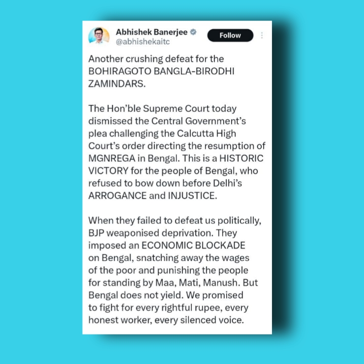 ১০০ দিনের প্রকল্পের টাকা আটকে রাখায় কেন্দ্রীয় সরকারের বিরুদ্ধে আন্দোলন করেছে তৃণমূল। বঞ্চিতদের নিয়ে দিল্লিতে ধর্নাও দিতে গিয়েছিলেন অভিষেক বন্দ্যোপাধ্যায়। দিল্লি থেকে ফিরে পাঁচ দিন ধরে কলকাতায় রাজভবনের সামনেও ধর্নাতে বসেছিলেন তৃণমূলের সর্বভারতীয় সাধারণ সম্পাদক। সুপ্রিম কোর্ট হাইকোর্টের রায়ের উপর হস্তক্ষেপ না করায় এখন রাজ্যের হাতে ১০০ দিনের কাজের টাকা তুলে দিতে হবে কেন্দ্রীয় সরকারকে।