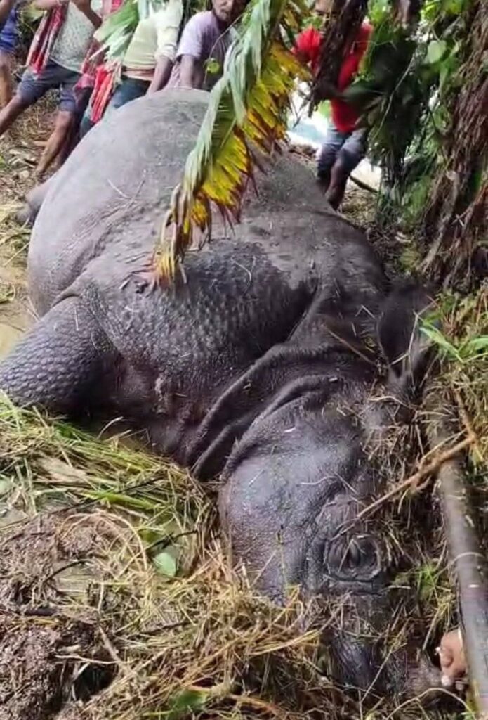 হড়পা বানে মৃত গন্ডার। গরুমারা জাতীয় উদ্যান সংলগ্ন এলাকায় জলঢাকা নদী থেকে গন্ডারটির দেহ উদ্ধার করা হয়। সংগৃহীত ফটো