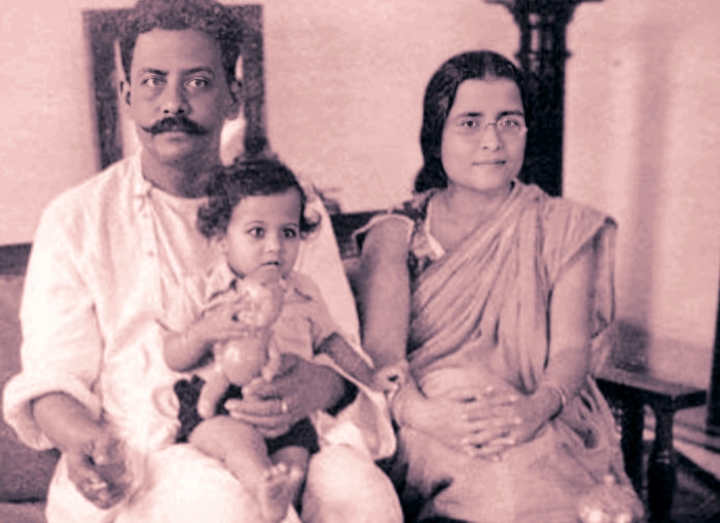 কবিদম্পতি নরেন্দ্র দেব ও রাধারানি দেবী। নরেন্দ্র দেবের কোলে ছোট্ট নবনীতা। ছবি: সংগৃহীত